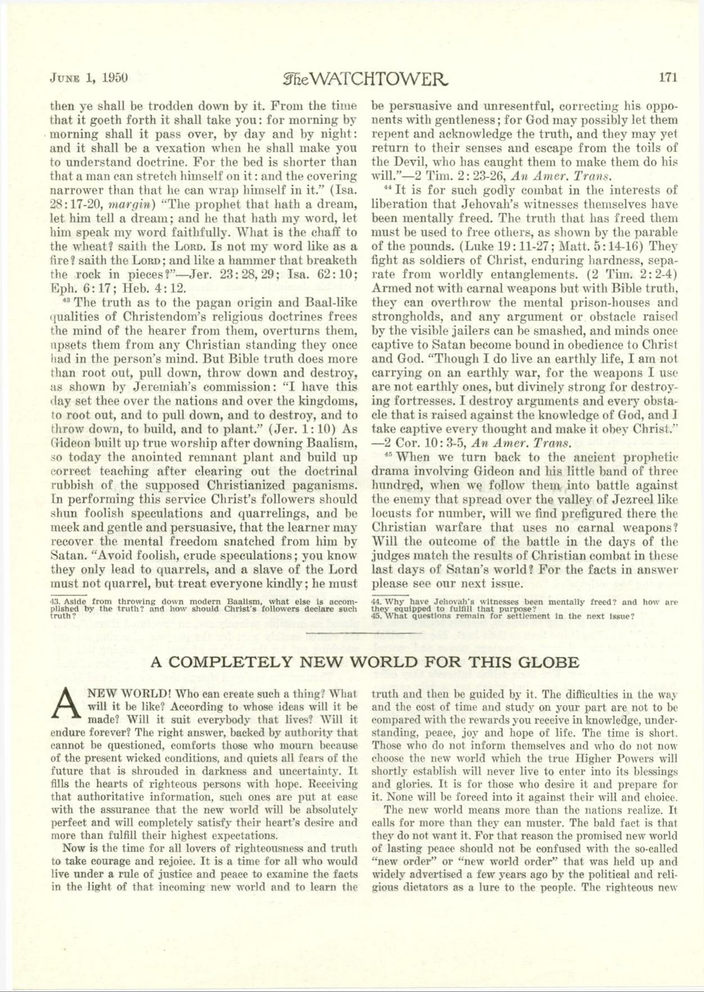 44 Este pentru o astfel de luptă divină în interesul eliberării pentru care martorii lui Iehova înșiși au fost eliberați mental. Adevărul care i-a eliberat pe ei trebuie folosit pentru a-i elibera pe alții, așa cum arată parabola celor zece talanți. Ei luptă ca soldați ai lui Cristos, suportând dificultăți, separați de încurcăturile lumești. (2 Tim. 2: 2-4) Înarmați nu cu arme carnale, ci cu adevărul biblic, ei pot răsturna închisorile mentale și fortărețele, iar orice argument sau obstacol ridicat de temnicerii vizibili poate fi distrus, iar mințile odată captive lui Satan devin legate în obediență de Cristos și de Dumnezeu. „Deși trăiesc o viață pământească, eu nu duc un război pământesc, căci armele pe care le folosesc eu nu sunt cele pământești, ci puternice divin pentru a distruge fortărețele. Eu distrug argumente și orice obstacol care este ridicat împotriva cunoașterii lui Dumnezeu și iau captiv fiecare gând și îl fac să asculte de Cristos.” - 2 Corinteni 10: 3-5, An Amer. Trans.