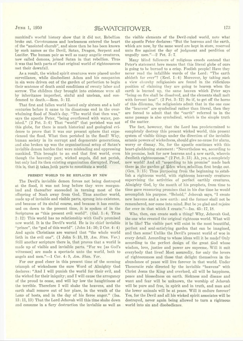 Forțele invizibile de demoni ale Diavolului, nefiind distruse în timpul inundației, nu a durat mult până când au fost reorganizate și, ulterior, au reușit să abată majoritatea urmașilor lui Noe de la Dumnezeu. Așadar, o altă lume, compusă din părți invizibile și vizibile, a luat naștere, iar din cauza cursului său păcătos și pentru că a continuat până în prezent, este menționată în Scripturi ca „această lume rea prezentă”. (Galateni 1: 4; Tit 2: 12) Această lume nu are nicio legătură cu noua lume promisă de Dumnezeu. Aceasta este lumea Diavolului. El este „prințul” invizibil principal al acesteia, „dumnezeul acestei lumi”.(Ioan 14: 30; 2 Corinteni 4: 4) Și din nou, creștinii sunt avertizați că „întreaga lume zace în cel rău”. (1 Ioan 5: 18, 19, Am. Stan. Ver.) Există încă o altă scriptură care dovedește că o lume este compusă din parte vizibilă și parte invizibilă. „Căci noi [ca martori ai lui Dumnezeu] am fost făcuți un spectacol pentru lume, atât pentru îngeri, cât și pentru oameni.” — 1 Cor. 4: 9, Am. Stan . Ver.