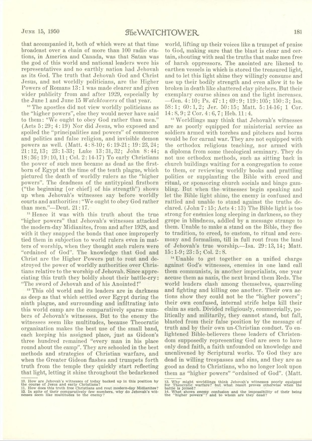 14 Incapabili să se unească într-o acuzație comună împotriva martorilor lui Dumnezeu, dușmanii dintr-o țară îi numesc comuniști, în alta imperialiști, într-un an îi acuză de nazism, iar în anul următor îi etichetează ca fiind Reds. Liderii lumii se ciocnesc între ei, certându-se, luptându-se și ucigându-se unii pe alții. Propriile lor acțiuni arată că ei nu pot fi „puterile superioare”; propriile lor conflicte interne, confuze, îi ajută să ucidă pretenția ca atare. Divizați religios, comercial, politic și militar, ei nu pot sta în picioare, ci cad, dați jos din poziția lor falsă de mesajul adevărului și de propria lor conduită necreștină. Pentru credincioșii iluminați de biblie, acești lideri ai Creștinătății, care pretind că îl reprezintă pe Dumnezeu, sunt văzuți ca având doar o credință moartă, o credință nefondată pe cunoștință și neînsuflețită de lucrările scripturale. Pentru Dumnezeu, ei sunt morți în păcatele și fărădelegile lor, și sunt la fel de buni ca morți pentru creștini, care nu îi mai privesc ca pe „puterile superioare” „întemeiate de Dumnezeu”.(Matei