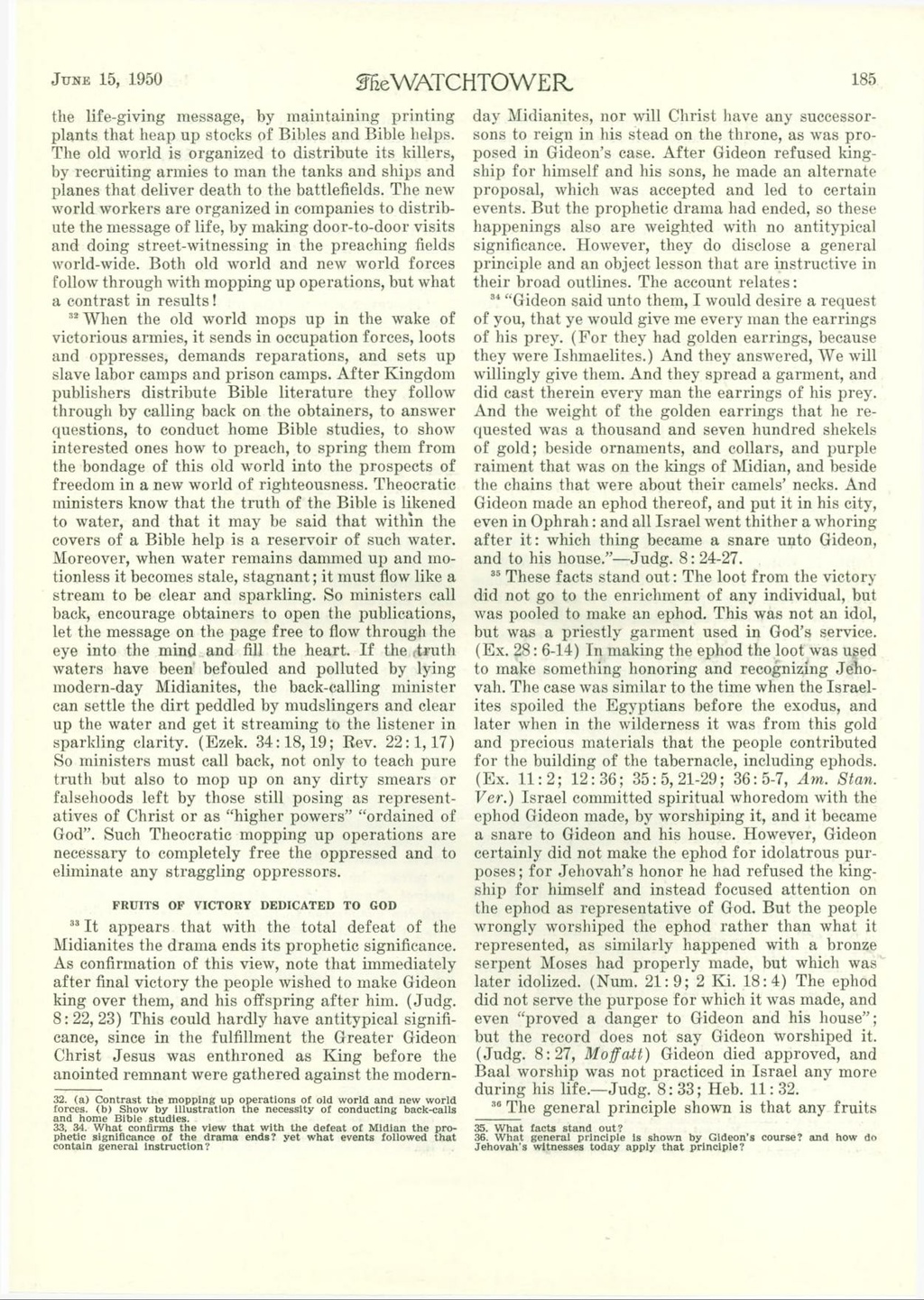 33 Se pare că, odată cu înfrângerea totală a midianitilor, drama își încheie semnificația profetică. Ca o confirmare a acestei viziuni, observați că imediat după victoria finală, poporul a dorit să-l facă pe Ghedeon rege peste ei și pe urmașii săi după el. (Judecători 8: 22, 23) Aceasta nu ar putea avea o semnificație antitipică, deoarece în împlinire, Mai Marele Ghedeon, Cristos Isus, a fost întronat ca Rege înainte ca rămășița unsă să fie adunată împotriva madianiților