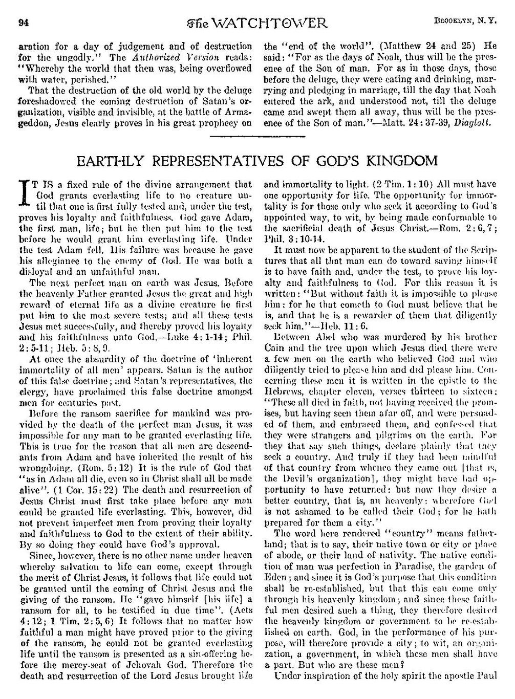 Între Abel, care a fost ucis de fratele său Cain, și lemnul pe care a murit Isus, au existat câțiva oameni pe pământ care au crezut în Dumnezeu și care au încercat cu diligență să-i fie plăcuți și chiar i-au fost plăcuți. Despre acești oameni este scris în epistola către Evrei, capitolul unsprezece, versetele treisprezece la șaisprezece: „Toți aceștia au murit în credință, fără să fi primit promisiunile, ci le-au văzut de departe, le-au îmbrățișat și au mărturisit că sunt străini și călători pe tot pământul. Căci cei ce spun astfel de lucruri mărturisesc deschis că ei caută o țară. Și, într-adevăr, dacă ar fi avut în aminte țara din care au ieșit [adică organizația Diavolului], ei ar fi avut oportunitatea să se întoarcă; dar acum ei doresc o țară mai bună, adică una cerească: de aceea, lui Dumnezeu nu îi este rușine să se numească Dumnezeul lor, căci le-a pregătit o cetate.”