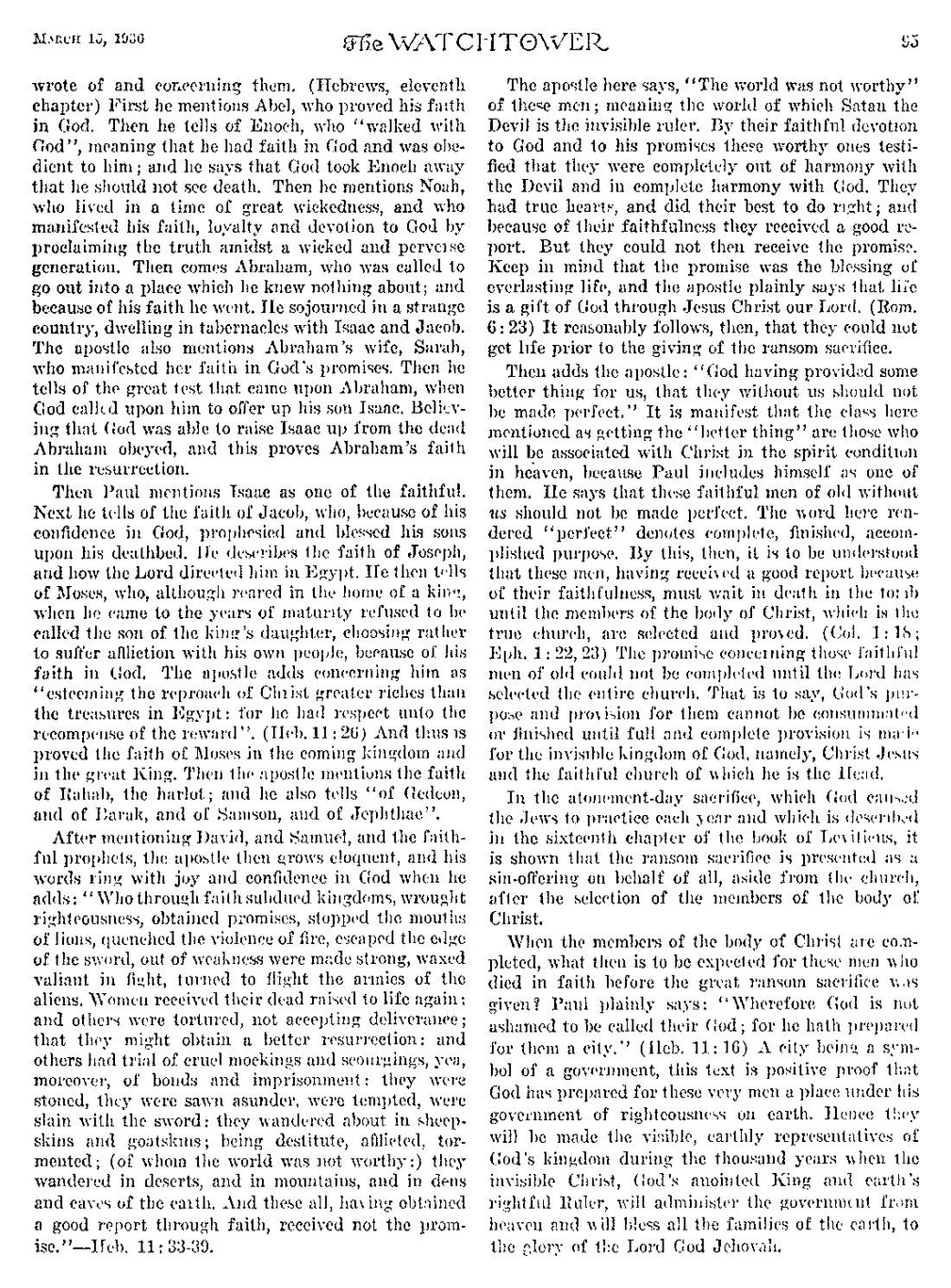 Când membrii trupului lui Cristos sunt compleți, ce se poate aștepta atunci pentru acești oameni care au murit în credință înainte de marele sacrificiu de răscumpărare? Pavel spune clar: „De aceea, lui Dumnezeu nu-i este rușine să fie numit Dumnezeul lor, căci le-a pregătit o cetate.” (Evrei 11: 16) O cetate fiind un simbol al unui guvern, acest text este o dovadă clară că Dumnezeu a pregătit chiar pentru acești oameni un loc sub guvernarea sa a dreptății pe pământ. Prin urmare, ei vor fi făcuți reprezentanți vizibili, pământești, ai regatului lui Dumnezeu în timpul celor o mie de ani, când Cristosul invizibil, Regele uns al lui Dumnezeu și Conducătorul de drept al pământului, va administra guvernul din cer și va binecuvânta toate familiile pământului, spre gloria Domnului Dumnezeu Iehova.
