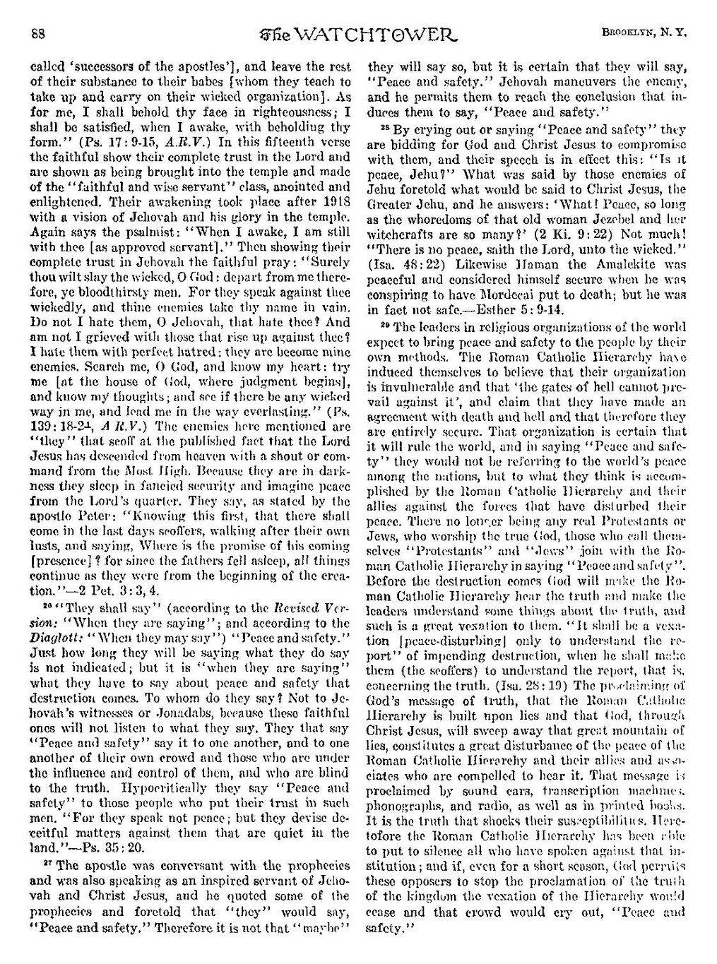 29 Liderii organizațiilor religioase ale lumii se așteaptă să aducă pace și siguranță oamenilor prin propriile metode. Ierarhia Romano-Catolică s-a convins, ea însăși, că organizația sa este invulnerabilă și că „porțile iadului nu o pot învinge” și susține că a făcut un pact cu moartea și cu iadul și că, prin urmare, este în deplină siguranță. Acea organizație este sigur că va conduce lumea și, spunând „Pace și siguranță”, nu se referă la pacea lumii între națiuni, ci la ceea ce cred că este realizat de Ierarhia Romano-Catolică și aliații săi împotriva forțelor care le-au tulburat pacea. Neexistând protestanți sau evrei adevărați care se închină adevăratului Dumnezeu, cei care se numesc „Protestanți” și „Evrei” se alătură Ierarhiei Romano-Catolice spunând „Pace și siguranță”. Înainte de a veni distrugerea, Dumnezeu va face ca Ierarhia Romano-Catolică să audă adevărul și îi va face pe lideri să înțeleagă unele lucruri despre adevăr, iar aceasta este o mare supărare pentru ei. „Va fi o supărare [care tulbură pacea] doar să înțeleagă „raportul” despre distrugerea iminentă, când el îi va face (pe batjocoritori) să înțeleagă raportul, adică în legătură cu adevăr.ul” (Isaia 28: 19) Proclamarea mesajului lui Dumnezeu al adevărului, că Ierarhia Romano-Catolică este zidită pe minciuni și că Dumnezeu, prin Cristos Isus, va mătura acel munte mare de minciuni, constituie o mare tulburare a păcii Ierarhiei Romano-Catolice și a aliaților și asociaților ei care sunt obligați să-l audă. Acel mesaj este proclamat prin mașini de sunet, mașini de transcriere, fonografe și radio, precum și prin cărți tipărite. Adevărul este cel care șochează susceptibilitatea lor. Până acum, Ierarhia Romano-Catolică a reușit să reducă la tăcere pe toți cei care au vorbit împotriva acelei instituții; și dacă, chiar și pentru o scurtă perioadă, Dumnezeu le permite acestor opozanți să oprească proclamarea adevărului regatului, supărarea Ierarhiei ar înceta și acea mulțime ar striga, „Pace și siguranță.”
