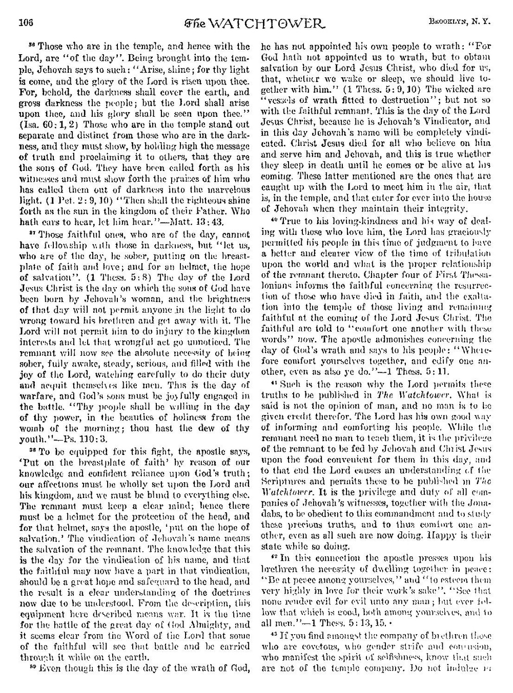 37 Cei loiali, care sunt ai zilei, nu pot avea tovărășie cu cei aflați în întuneric, ci „noi, care suntem ai zilei, să fim sobri, îmbrăcându-ne cu platoșa credinței și a iubirii; și drept coif, speranța salvării”. (1 Tesaloniceni 5: 8) Ziua Domnului Isus Cristos este ziua în care fiii lui Dumnezeu au fost născuți de femeia lui Iehova, iar strălucirea acelei zile nu va permite nimănui aflat în lumină să facă rău fraților săi și să scape nepedepsit. Domnul nu-i va permite să prejudicieze interesele regatului și să lase ca acel act greșit să treacă neobservat. Rămășița va vedea acum necesitatea absolută de a fi sobră, pe deplin trează, fermă, serioasă și plină de bucuria Domnului, veghind cu atenție pentru a-și face datoria și a se achita ca oameni. Aceasta este ziua războiului, iar fiii lui Dumnezeu trebuie să fie angajați cu bucurie în luptă. „Poporul tău va fi doritor în ziua puterii tale, în frumusețile sfințeniei din pântecele zorilor; tu ai roua tinereții tale.” -- Ps. 110: 3.