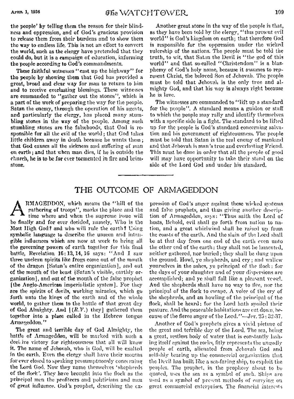 expresiei mâniei lui Dumnezeu împotriva acestor sisteme rele și profeți falși și oferind astfel o altă descriere a Armaghedonului, spune: „Așa vorbește Domnul armatelor: «Iată, nenorocirea se va întinde de la națiune la națiune și o mare furtună se va ridica de la marginile pământului. Cei uciși de Domnul vor fi în ziua aceea de la o margine a pământului chiar până la cealaltă; nu vor fi nici plânși, nici adunați, nici îngropați, ci vor fi aruncați ca gunoi de grajd pe pământ. Urlați, păstori, strigați și tăvăliți-vă în cenușă, voi, căpeteniile turmei! Căci zilele măcelului și risipirii voastre s-au împlinit; și veți cădea ca un vas scump. Păstorii nu vor avea cum să fugă, nici căpeteniile turmei nu vor avea cum să scape. Se va auzi strigătul păstorilor și urletul căpeteniilor turmei, căci Domnul le-a nimicit turma. Și locuințele liniștite sunt nimicite din cauza mâniei aprinse a Domnului.»” - Ieremia. 25: 32-37.