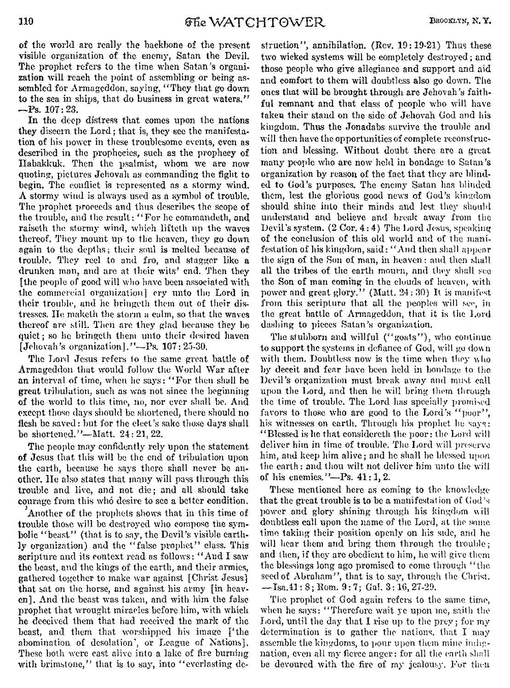 În necazul profund care vine peste națiuni, ei îl descoperă pe Domnul; adică, ei văd manifestarea puterii sale în aceste evenimente tulburătoare, chiar așa cum sunt descrise în profeții, cum ar fi profeția lui Habacuc. Apoi, psalmistul, pe care îl cităm acum, îl înfățișează pe Iehova poruncind începerea luptei. Conflictul este reprezentat ca un vânt furtunos. Un vânt furtunos este întotdeauna folosit ca simbol al necazului. Profetul continuă și descrie astfel amploarea necazului și rezultatul: „Căci El poruncește și ridică un vânt puternic care ridică valurile lui. Se suie până la cer, se coboară iarăși în adâncuri; sufletul li se topește din cauza necazului. Ei se împleticesc încoace și încolo, se clatină ca un om beat și sunt la capătul răbdării. Atunci ei [oamenii cu bunăvoință care au fost asociați cu organizația comercială] strigă către Domnul în necazul lor și el îi scoate din necazurile lor. El liniștește furtuna și valurile lui se potolesc. Atunci ei se bucură că sunt liniștiți; și el îi aduce la portul dorit [organizația lui Iehova].” -- Psalmul 107: 25-30.