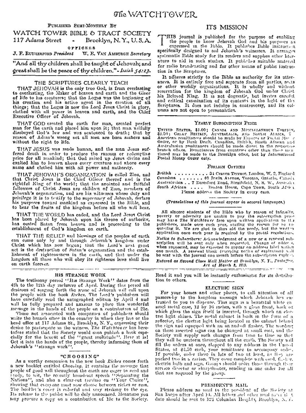 Ca un însoțitor demn a noii cărți „Bogății” apare o nouă broșură intitulată „Alegând”. Aceasta conține mesajul pe care oamenii cu bunăvoință din întreaga lume sunt dornici să-l citească și să-l studieze, și anume discursul difuzat recent „Separarea Națiunilor”, precum și un tratat clar despre „Alegerea ta”, care arată că toată lumea trebuie acum să aleagă între bogăție și ruină. Coperta broșurii este colorată și foarte atrăgătoare pentru ochi. Lansarea sa către public va fi anunțată în mod corespunzător. Între timp, puteți obține un exemplar pentru o contribuție de 10 cenți către Societate.