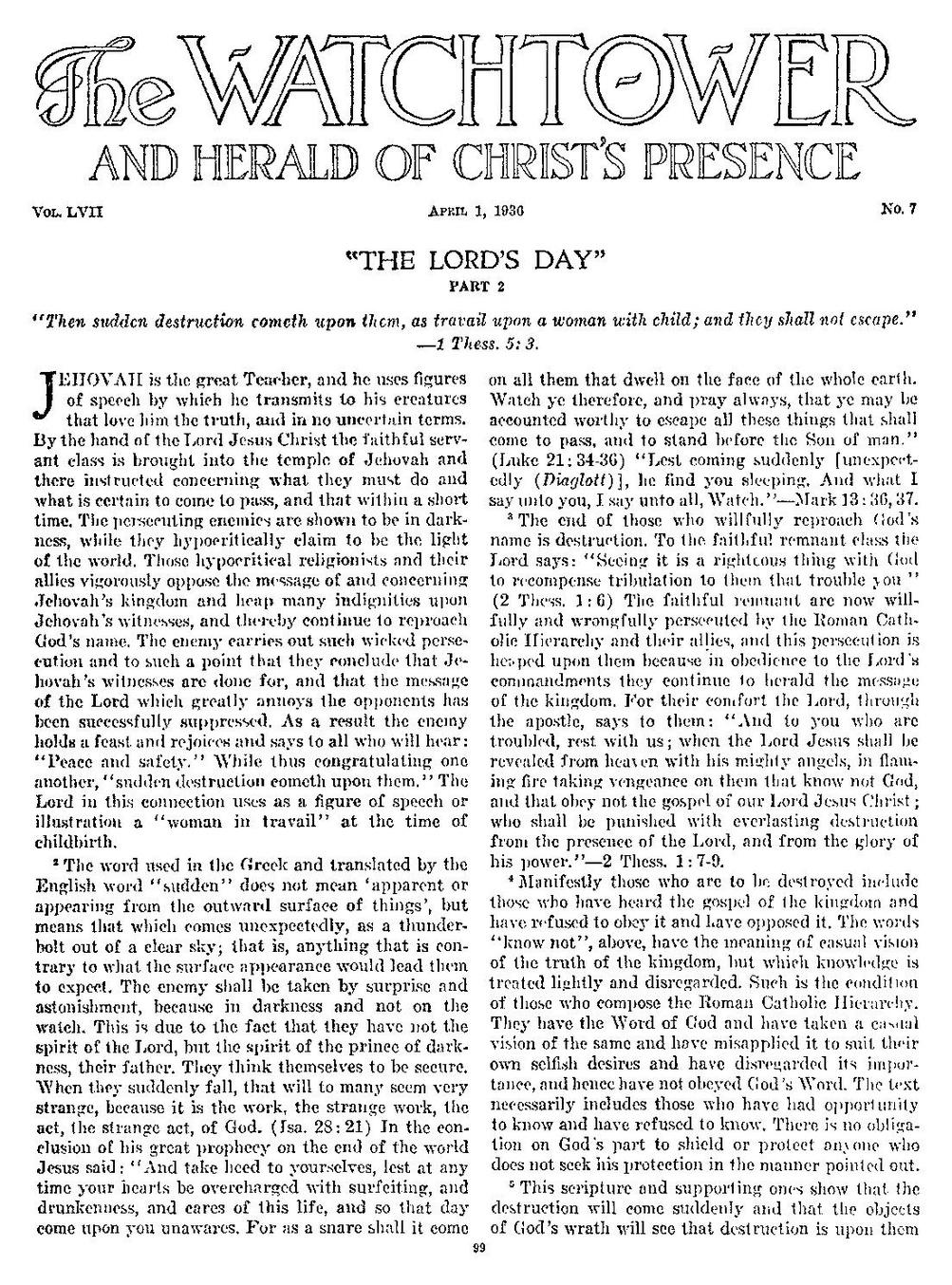 2 Cuvântul folosit în greacă și tradus prin cuvântul englezesc „sudden” nu înseamnă „aparent sau care apare de la suprafața exterioară a lucrurilor”, ci înseamnă ceea ce vine pe neașteptate, ca un fulger dintr-un cer senin; adică orice este contrar a ceea ce aparențele exterioare i-ar conduce să se aștepte. Dușmanul va fi luat prin surprindere și uimire, pentru că este în întuneric și nu în veghe. Acest lucru se datorează faptului că nu au spiritul Domnului, ci spiritul prințului întunericului, tatăl lor. Ei cred că sunt în siguranță. Când ei cad brusc, acest lucru li se va părea multora foarte ciudat, pentru că este lucrarea, lucrarea ciudată, actul, actul ciudat al lui Dumnezeu. (Isaia 28: 21) În încheierea marii sale profeții despre sfârșitul lumii, Isus a spus: „Și luați seama la voi înșivă, ca nu cumva inimile voastre să fie împovărate cu îmbuibare, beție și grijile vieții acesteia, și ziua aceea să vină pe neașteptate peste voi. Căci va veni ca o capcană