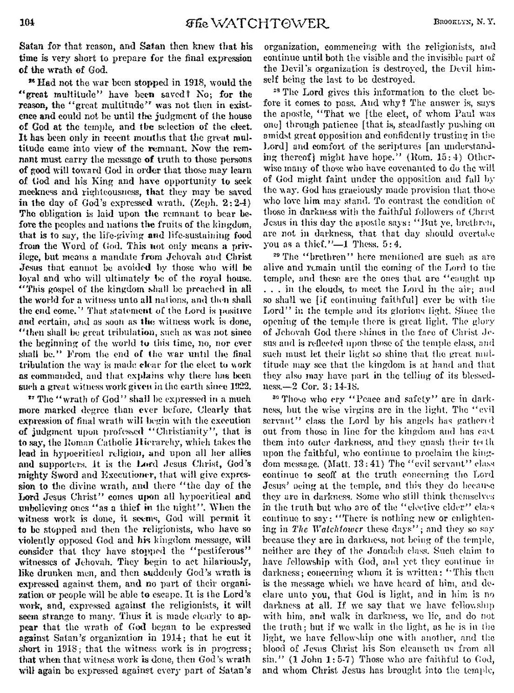 27 „Mânia lui Dumnezeu” se va exprima într-o măsură mult mai pronunțată ca niciodată. Evident, acea expresie a mâniei finale va începe odată cu executarea judecății asupra „Creștinismului” declarat, adică asupra Ierarhiei Romano-Catolice, care preia conducerea în religia ipocrită, și asupra tuturor aliaților și susținătorilor ei. Este Domnul Isus Cristos, Sabia și Executorul puternic al lui Dumnezeu, cel care va da expresie mâniei divine și acolo „ziua Domnului Isus Cristos” va veni peste toți cei ipocriți și necredincioși „ca un hoț noaptea”. Se pare că, atunci când lucrarea de mărturie va fi finalizată, Dumnezeu va permite ca ea să fie oprită și atunci religioșii, care s-au opus atât de violent lui Dumnezeu și mesajului regatului său, vor considera că i-au oprit pe martorii „pestiferi” ai lui Iehova. Ei încep să se comporte hilar, ca niște oameni beți, iar apoi, dintr-o dată, mânia lui Dumnezeu se exprimă împotriva lor și nicio parte a organizației sau a oamenilor lor nu va putea scăpa. Este lucrarea Domnului și, exprimată împotriva religioșilor, li se va părea ciudată multora. Astfel, se arată clar că mânia lui Dumnezeu a început să se exprime împotriva organizației lui Satan în 1914; că a întrerupt-o în 1918; că lucrarea de mărturie este în desfășurare; că atunci când această lucrare de mărturie va fi finalizată, atunci mânia lui Dumnezeu se va exprima din nou împotriva fiecărei părți a organizației