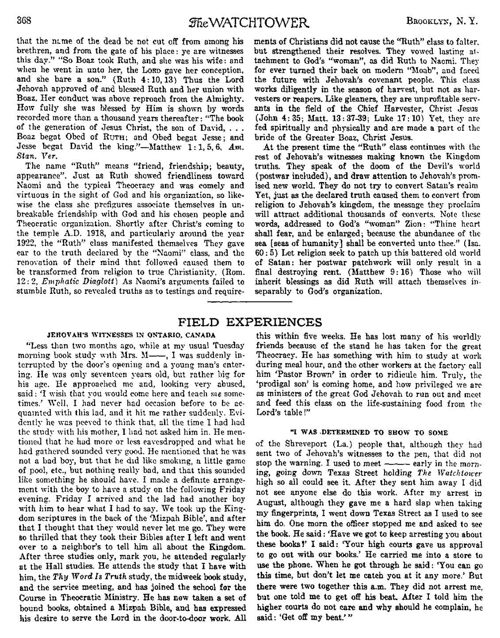 „Cu mai puțin de două luni în urmă, în timp ce eram la studiul meu obișnuit de marți dimineața cu doamna M----, am fost brusc întrerupt de deschiderea ușii și intrarea unui tânăr. Avea doar șaptesprezece ani, dar era destul de mare pentru vârsta lui. S-a apropiat de mine și, arătând foarte abuzat, a spus: 'Mi-aș dori să veniți aici și să mă învățați uneori.'” Ei bine, nu avusesem niciodată ocazia să-l cunosc pe acest băiat și am fost surprins destul de brusc. Evident, era supărat să creadă că, în tot timpul cât studiasem cu mama lui, nu-l invitasem înăuntru. A menționat că mai mult sau mai puțin trăsese cu urechea și că ceea ce aflase suna foarte bine. A menționat că nu era un băiat rău, dar că îi plăcea să fumeze, să joace o mică partidă de biliard etc., dar nimic cu adevărat rău și că asta părea ceva ce ar fi trebuit să facă. Am făcut o înțelegere clară cu băiatul să avem un studiu vinerea următoare seara. Vineri am ajuns și băiatul a avut un alt băiat cu el ca să audă ce aveam de spus. Am luat scripturile Regatului în spatele „Bibliei Mizpah” și, după aceea, m-am gândit că nu mă vor mai lăsa niciodată să plec. Au fost atât de încântați încât și-au luat Bibliile după ce am plecat și s-au dus la un vecin să-i spună totul despre Regat. După doar trei studii, rețineți, a participat regulat la studiile de la Sală. Participă la studiul pe care îl țin cu el, studiul „Thy Word Is Truth”, studiul de carte din mijlocul săptămânii și întâlnirea de serviciu și s-a înscris la școală pentru Cursul de Serviciu Teocratic. Acum a luat un set de cărți legate, a obținut o Biblie Mițpa și și-a exprimat dorința de a-I sluji Domnului în lucrarea din ușă în ușă. Toate