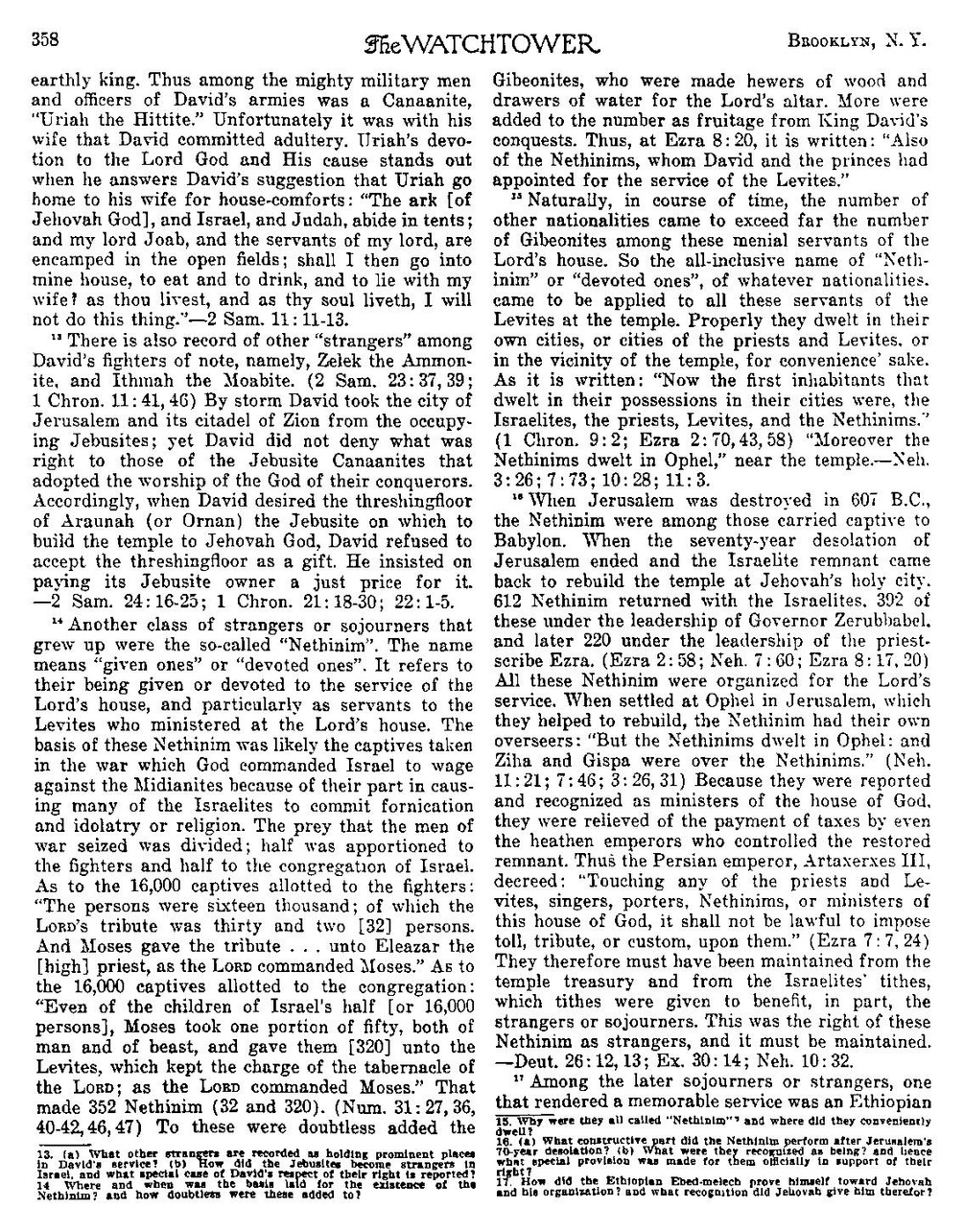 14 O altă clasă de străini sau rezidenți temporari care s-a dezvoltat a fost așa-numiții 'Nethinim'. Numele înseamnă 'cei dați' sau 'cei dedicați'. Se referă la faptul că au fost dați sau dedicați în serviciul casei Domnului, și în special ca slujitori pentru leviții care slujeau în casa Domnului. Baza acestor Nethinim era probabil prizonierii luați în războiul pe care Dumnezeu a poruncit lui Israel să-l ducă împotriva madianiților din cauza rolului lor în determinarea multor israeliți să comită fornicație și idolatrie. Prada pe care o luaseră bărbații de război a fost împărțită; jumătate a fost alocată luptătorilor, iar jumătate congregației lui Israel.” În ceea ce privește cei 16.000 de prizonieri alocați luptătorilor: 'Persoanele erau șaisprezece mii; dintre care tributul DOMNULUI era treizeci și doi [32] de persoane. Și Moise a dat tributul ... lui Eleazar, [marele] preot, așa cum a poruncit DOMNUL lui Moise.' În ceea ce privește cei 16.000 de prizonieri alocați congregației: 'Chiar și din partea copiilor lui Israel [sau 16.000 de persoane], Moise a luat unul din cincizeci, atât din oameni, cât și din animale, și le-a dat [320] leviților, care păzeau slujba cortului DOMNULUI; așa cum a poruncit DOMNUL lui Moise.' Aceasta a făcut 352 de Nethinim (32 și 320). (Numeri 31:27, 36, 40-42, 46, 47) La aceștia s-au adăugat cu siguranță